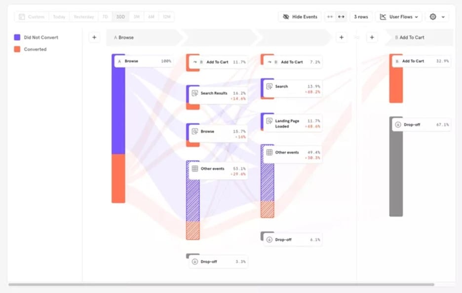 Mixpanel offers a user-friendly interface for setting up drop-off analysis. Define your funnel steps (events) and track user behavior throughout the journey.